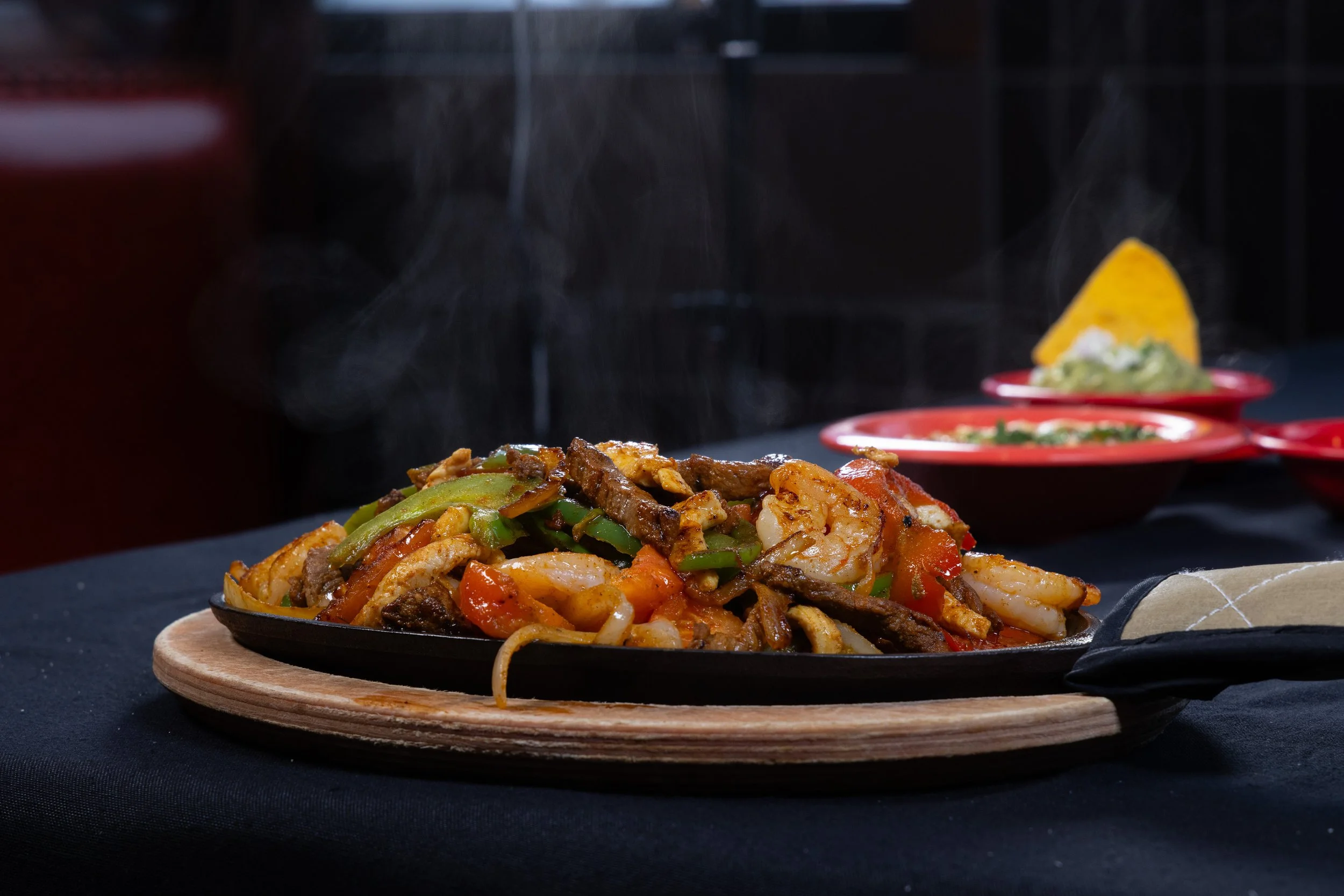 Steak + Shrimp + Grilled Chicken + Onions + Bell Peppers + Queso + Mexican Rice + Tortillas 12.75
